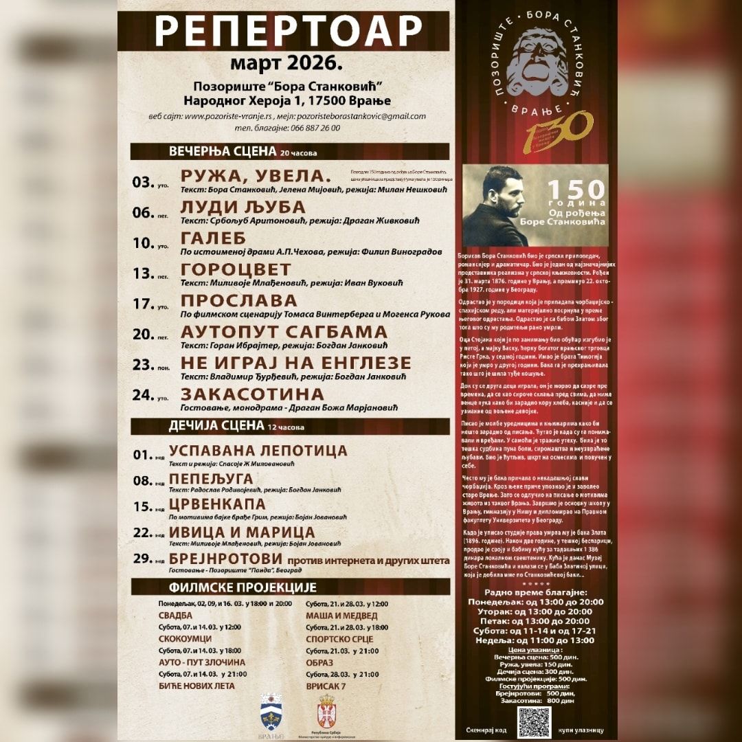 У петак, 13. марта од 20 часова у позоришту ће бити приказана представа ,,Гороцвет“, по тексту Миливоја Млађеновића и у режији Ивана Вуковића, док ће у уторак, 17. марта у истом термину публика моћи да погледа представу ,,Прослава“, по филмском сценарију Томаса Винтерберга и Могенса Рукова. На дечјој сцени у недељу, 15. марта, од 12 часова је представа ,,Црвенкапа“.